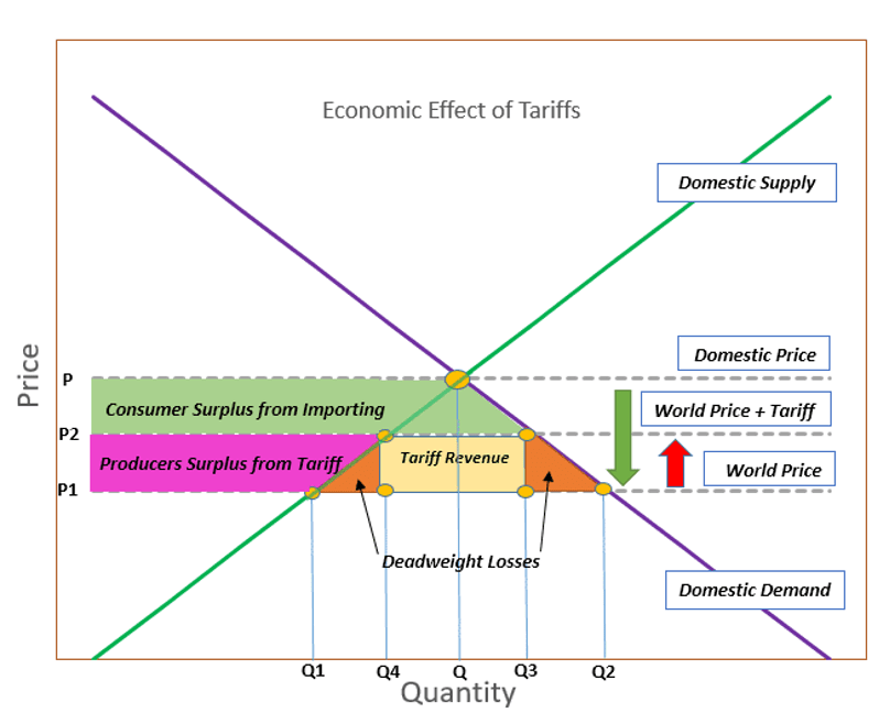However, with the imposition of tariffs on imports, the price rises from P1 to P2, incentivizing domestic producers to expand output to Q4 while simultaneously constraining consumer demand, reducing it from Q2 to Q3.